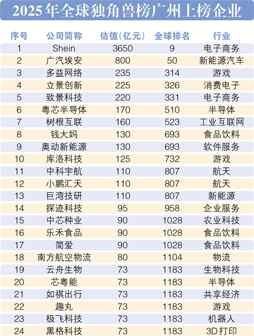 全球独角兽榜里,还有估值超3650亿的希音,新能源车代表埃安等,11家估值破百亿的企业。
