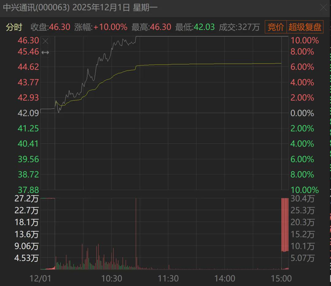 受此消息刺激,12月1日,中兴通讯强势上涨并在上午封死涨停。