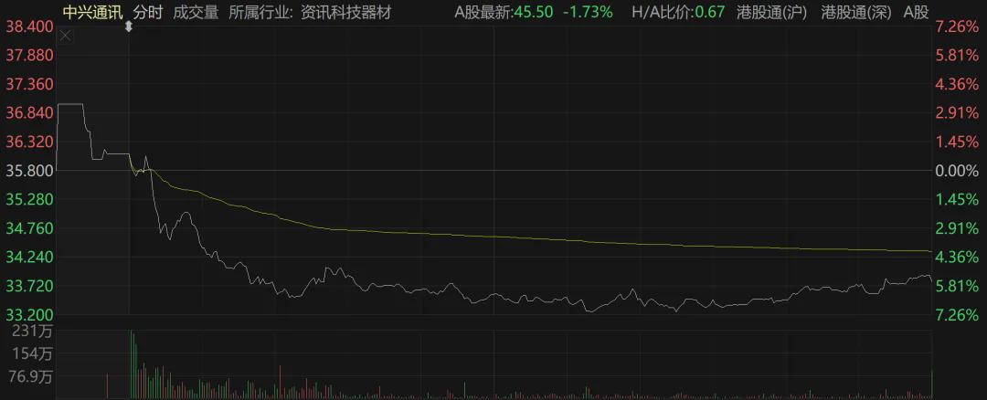同一天,港股中兴通讯收盘大跌超过5%,盘中更是大跌超过7%。