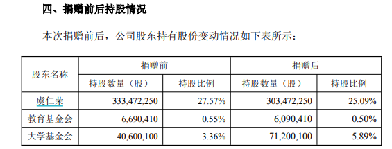 本次捐赠后,虞仁荣持股比例将从27.57%降至25.09%,教育基金会持股比例从0.55%降至0.50%,大学基金会持股比例从3.36%增至5.89%。