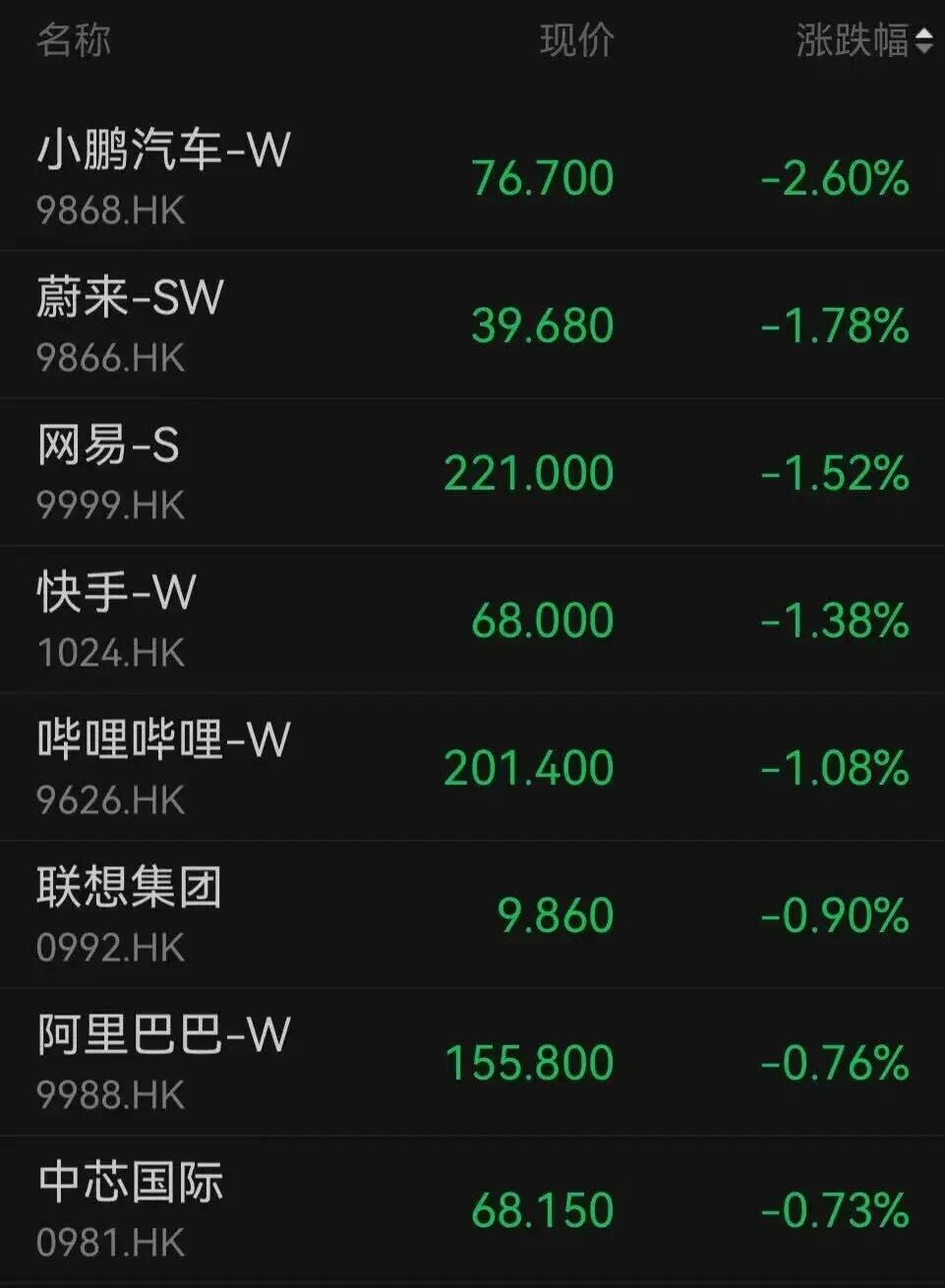 科网股开盘多数下跌,网易、快手、哔哩哔哩、阿里巴巴均走低。新能源车概念股跌幅居前, 小鹏汽车跌超2%,蔚来跌超1%。