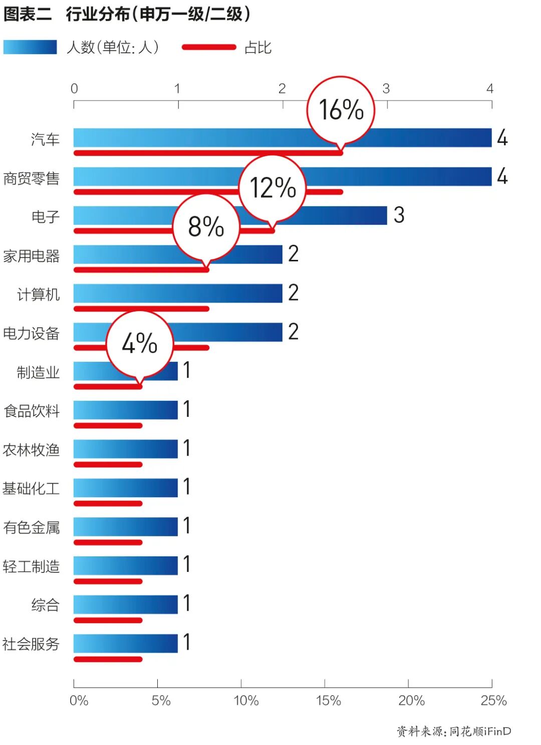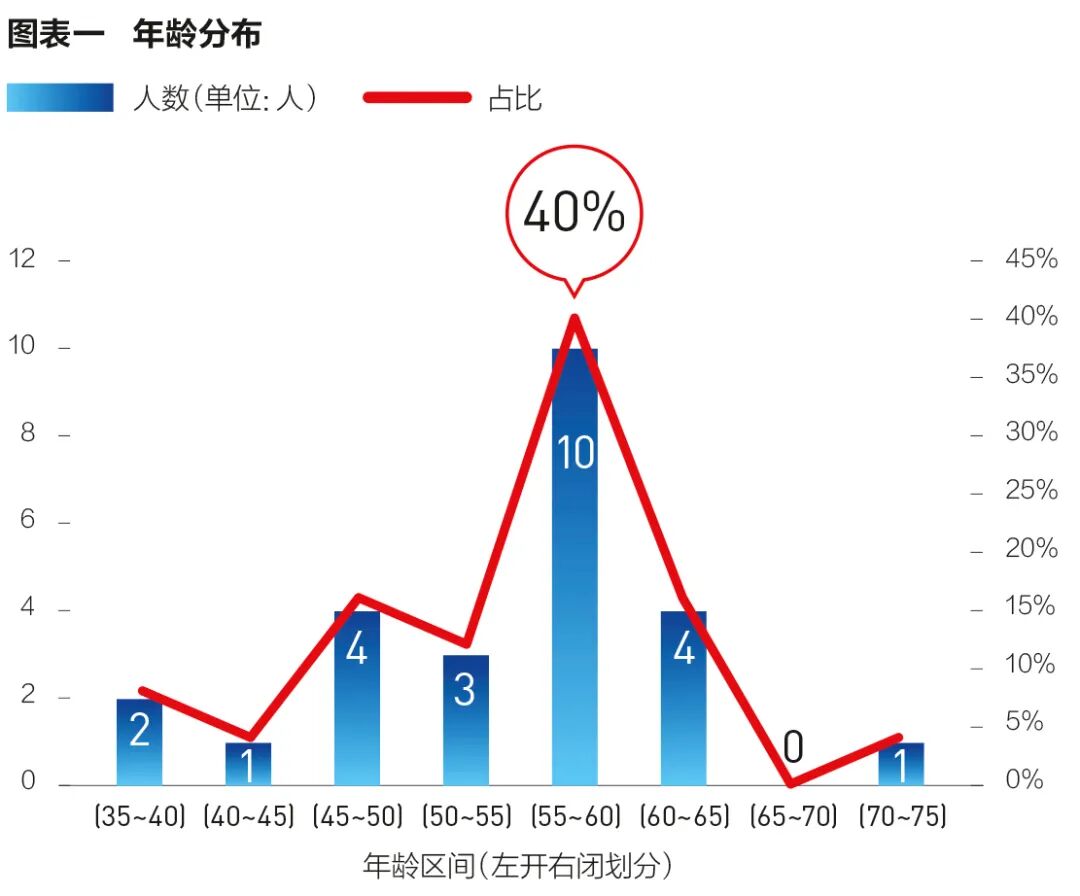 进入最终名单的25位企业家平均年龄55岁,其中年龄最大的是农夫山泉创始人钟睒睒(71岁),年龄最小的是首次进入名单的泡泡玛特创始人王宁(38岁)。年龄段55~60岁的人数最多,总体分布依然保持着两头小中间大的“橄榄型”结构(见图表一)。从籍贯来看,今年的分布较为集中,河南、安徽和湖北均有4位企业家,其次是山东和浙江各有3位企业家。河南是今年异军突起的一个省份,胖东来商贸集团于东来、牧原集团秦英林、泡泡玛特王宁和蜜雪冰城张红超均来自河南。再看申万一级行业分布情况:汽车有4人、商贸零售有4人、电子有3人,这也是今年进入最终名单人数最多的三个行业。需要说明一下,周云杰所在的海尔集团除了传统的家用电器外,旗下还有生物医药及大健康领域的上海生物、上海莱士和盈康生命,科技公司雷神科技以及金融平台众淼控股5家上市公司,行业间跨度较大,因此将其行业划分到综合(图表二)。