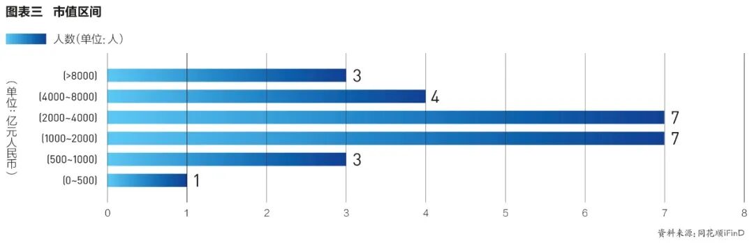 从企业市值/估值区间看,今年的“25位影响力企业家”所在企业大部分集中在1000亿~4000亿元人民币之间(见图表三)。目前A股5400多家上市公司中,约160家企业的市值超过1000亿元人民币,超过2000亿元人民币的约62家。由此可见,进入今年最终名单的企业家都是所在行业头部企业负责人。