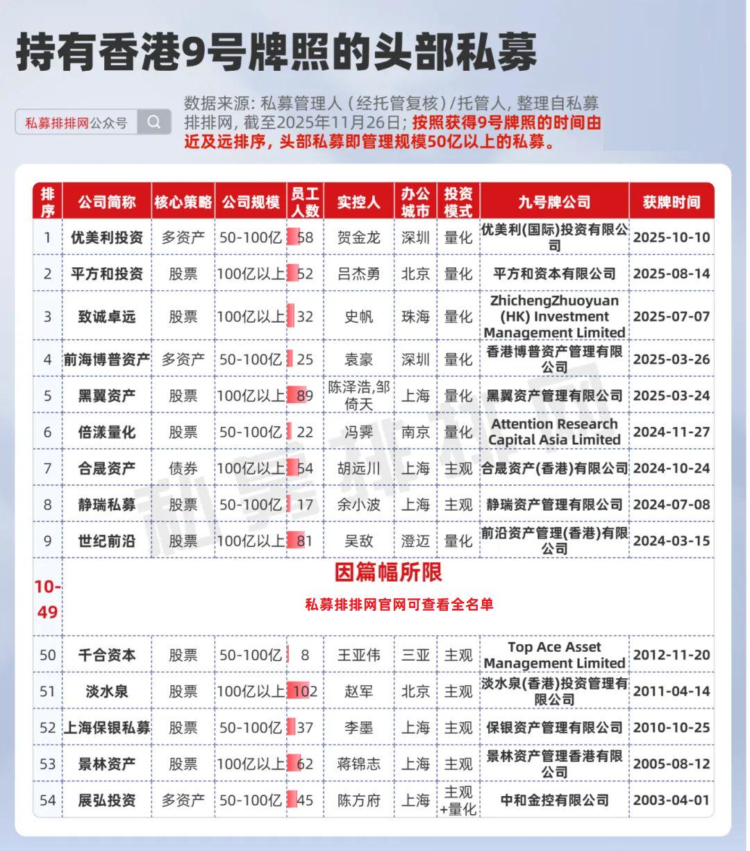 在头部私募(规模50亿以上)中,持有香港9号牌照的私募共有54家,其中年内获得9号牌照的私募共有5家,且均为量化私募,分别为优美利投资、平方和投资、致诚卓远、前海博普资产、黑翼资产。