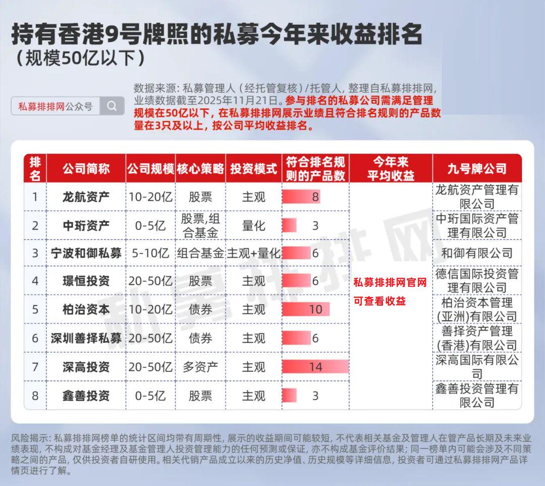 从业绩层面来看,在规模为50亿以下的私募中,今年来至少有3只产品符合排名规则且有业绩展示的私募共有8家。其中,收益位列前3的私募分别为:龙航资产、中珩资产、宁波和御私募。