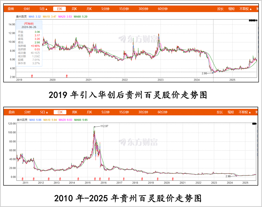 股价表现方面,华创证券进驻贵州百灵后,股价开始跌跌不休,2024年6月底最低达2.98元,摘帽后,最高也才一度达到6.94元,与此前水平相差悬殊。