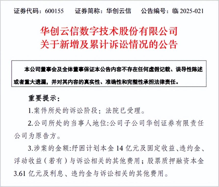 8月15日,华创云信发布公告,子公司华创证券诉贵州百灵大股东姜伟及其一致行动人的纾困计划及股票质押纠纷案,已收到当地法院案件受理通知。