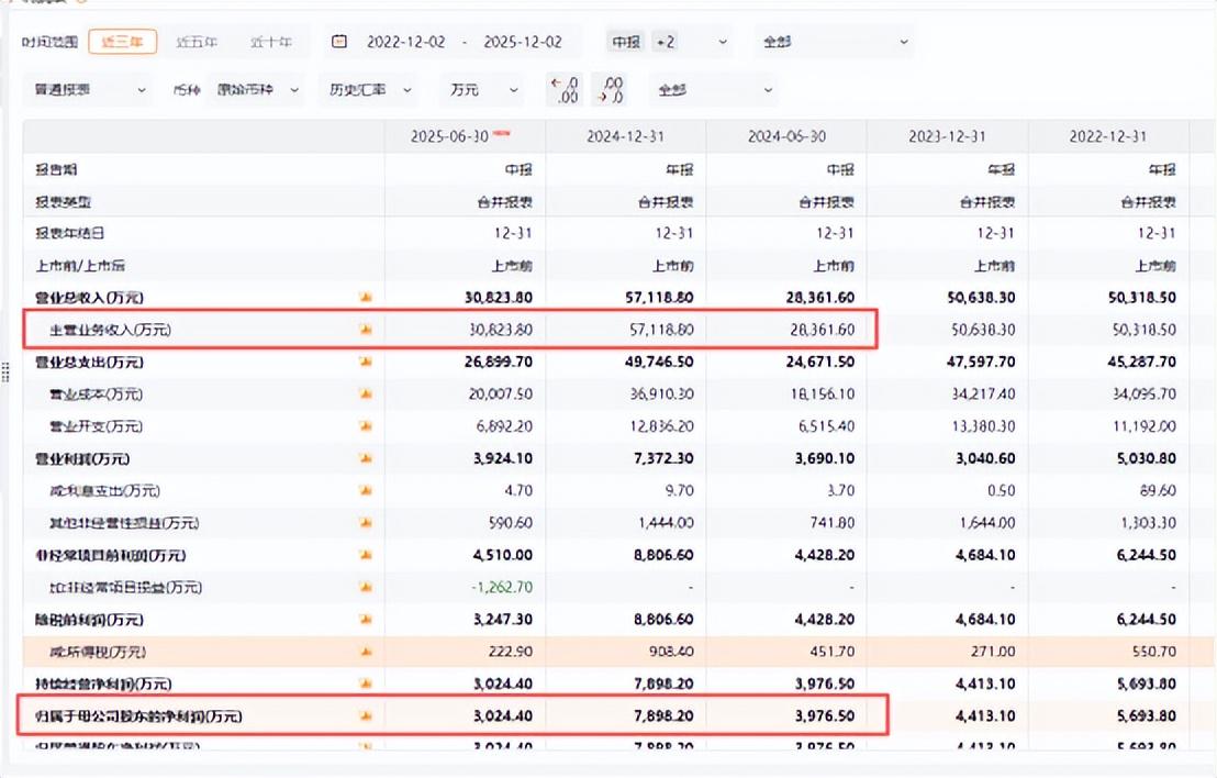 2025年上半年,铜师傅的主营业务收入为3.08亿元,相比去年同期的2.84亿元,增幅不足10%;归母净利润更出现了下滑,由2024年上半年的3976.5万元下滑至3024.4万元。