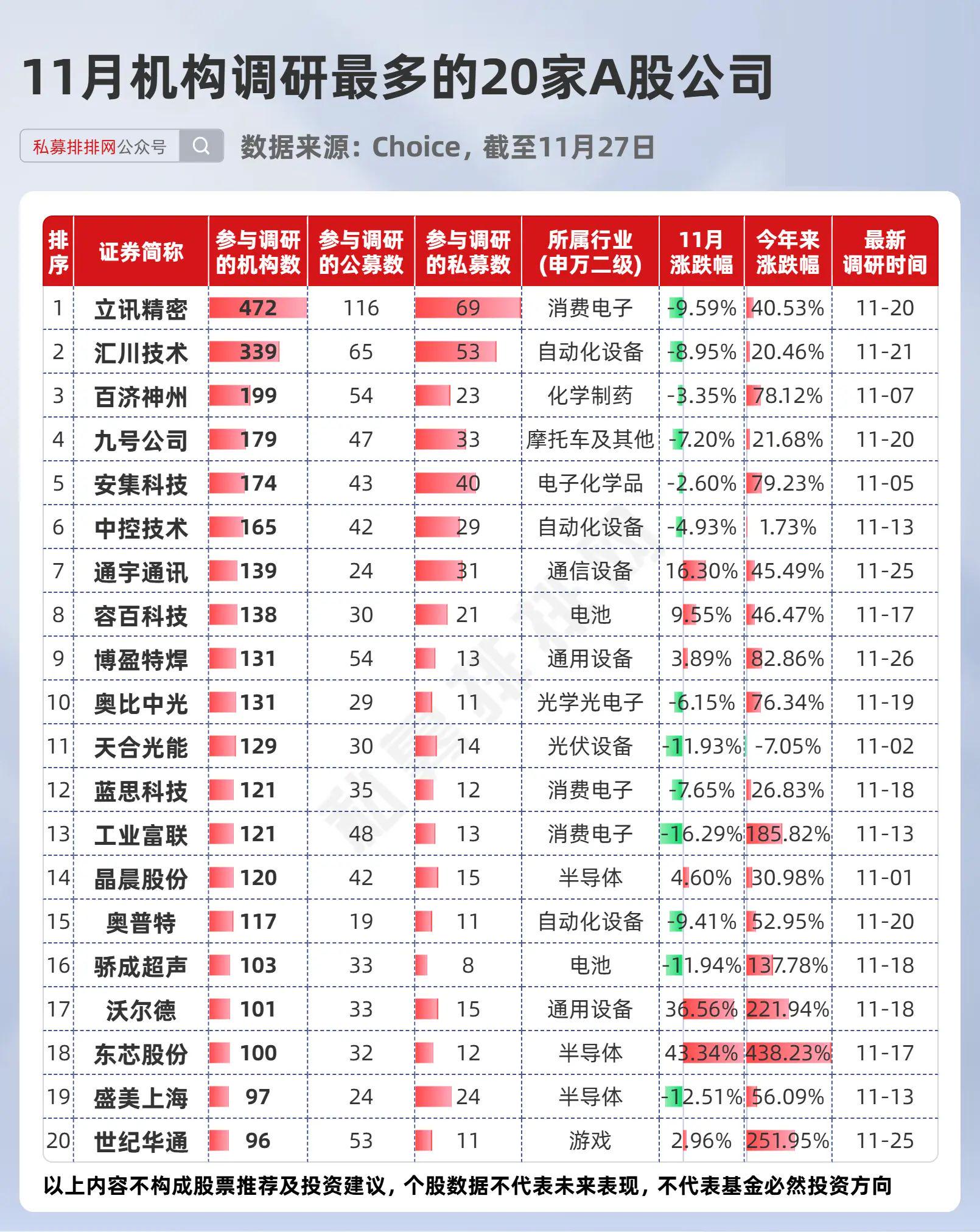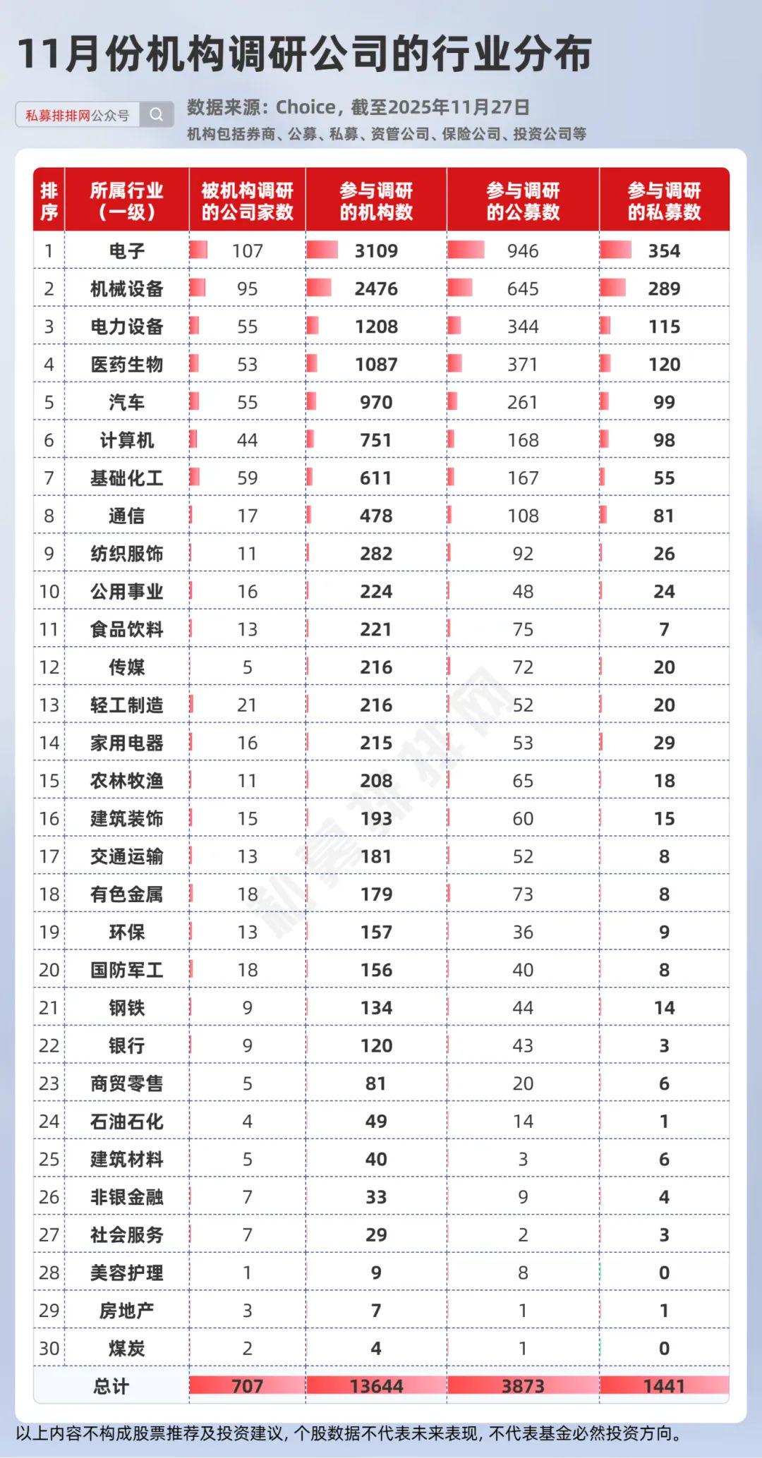 根据Choice数据,11月份(截至11月27日),机构共调研了707家A股公司,参与调研的机构家数累计为13644家;其中,私募机构共调研了360家A股公司,参与调研的私募家数累计为1441家。