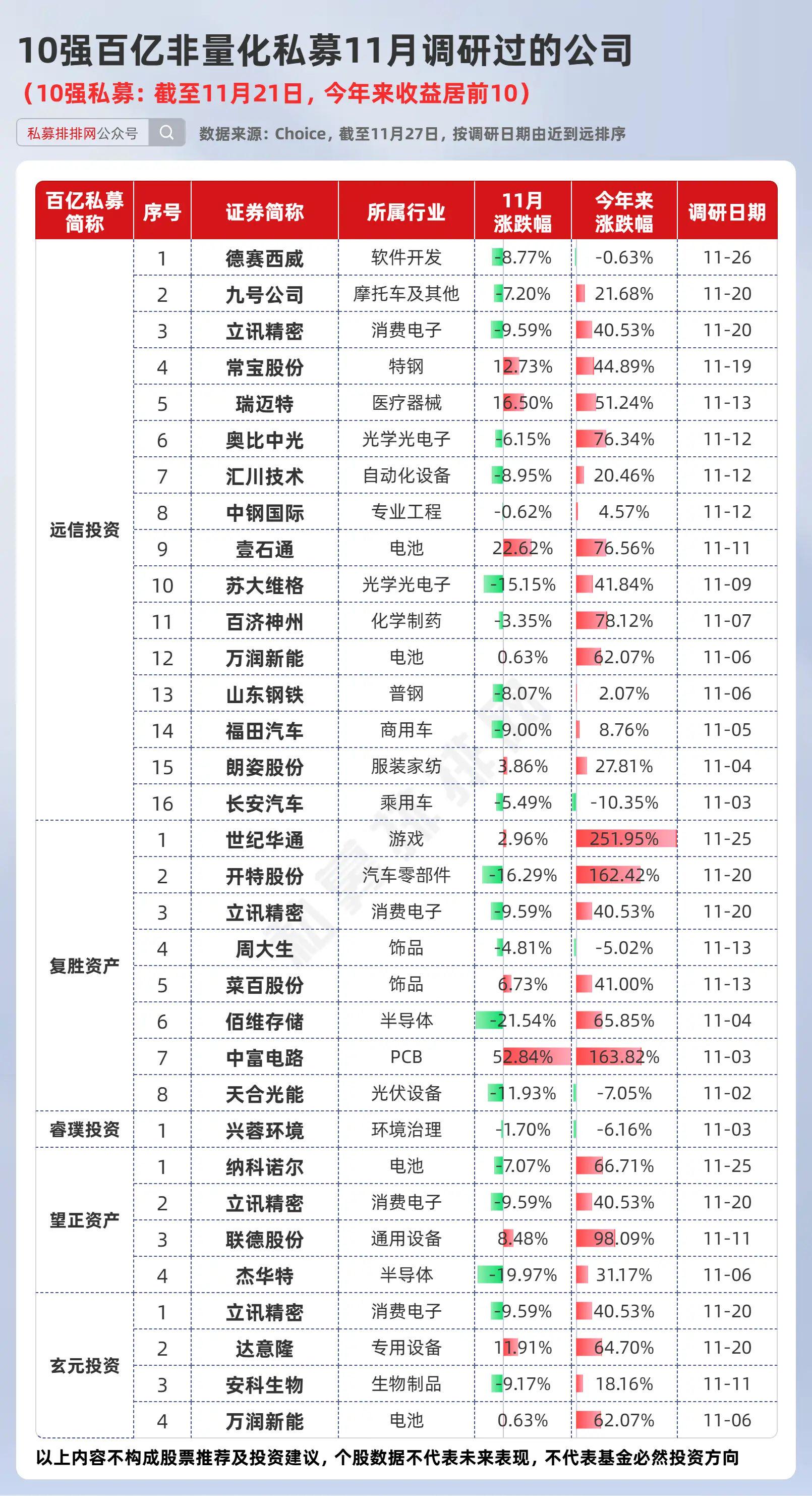 为了给读者提供一些参考,笔者特梳理出了今年来业绩居前的百亿非量化股票策略私募(包括主观私募和混合型私募)11月的调研动态。