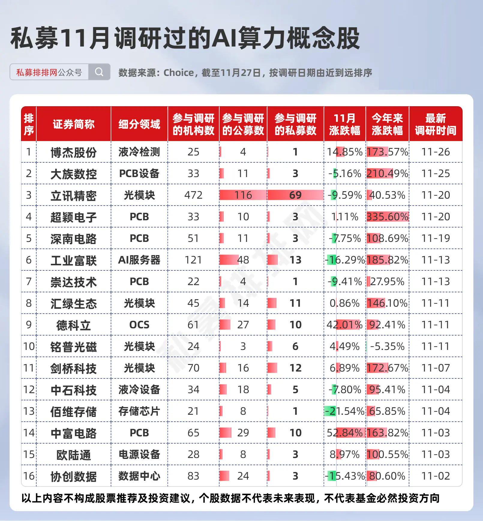 AI算力在横盘震荡数月后,谷歌TPU再次点燃AI算力板块,光模块龙头中际旭创于近期再创历史新高。经笔者梳理发现,11月份,私募调研过的AI算力股,共有16只。其中9只个股在今年来走出了翻倍行情。