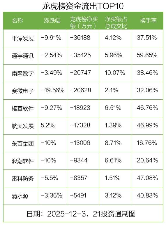 而龙虎榜中资金净流出最多的是平潭发展(000592.SZ),被净卖出为3.62亿元,占总成交金额的4.12%。平潭发展收盘下跌9.91%,换手率为37.51%。
