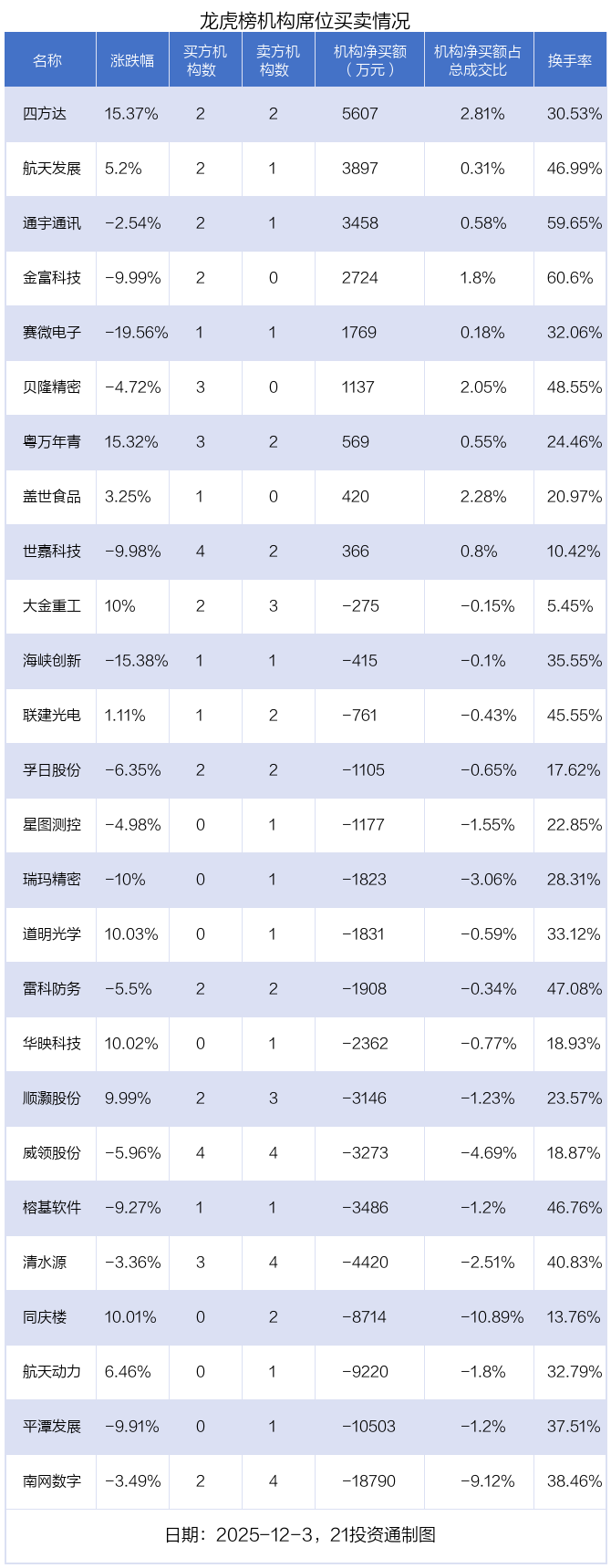 其中,机构净买入金额最多的是四方达(300179.SZ),当日收盘上涨15.37%,换手率为30.53%。