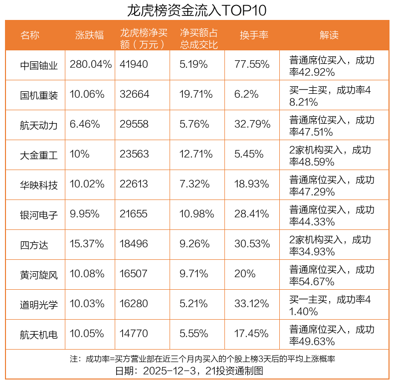 12月3日,上证指数下跌0.51%,深证成指下跌0.78%,创业板指下跌1.12%。盘后龙虎榜数据显示,共有51只个股因当日异动登上龙虎榜,资金净流入最多的是中国铀业(001280.SZ),达4.19亿元。