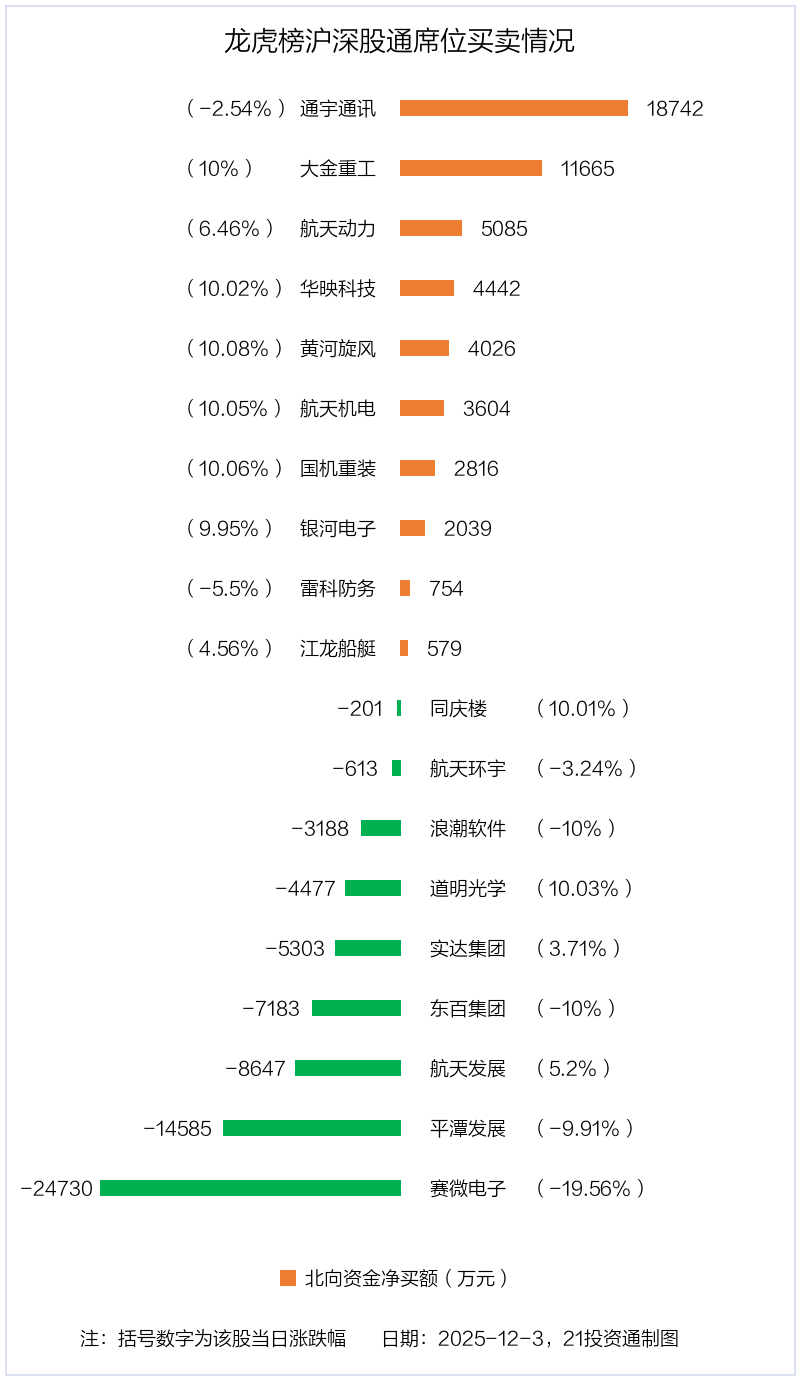 值得注意的是,机构和北向资金共同净买入了通宇通讯等1股;共同净卖出了同庆楼、道明光学、平潭发展等3股;在大金重工,航天动力,华映科技,雷科防务,航天发展,赛微电子上出现分歧,机构净卖出大金重工274.54万元,北向资金净买入1.17亿元;机构净卖出航天动力9219.63万元,北向资金净买入5085.02万元;机构净卖出华映科技2362.11万元,北向资金净买入4442.26万元;机构净卖出雷科防务1907.97万元,北向资金净买入753.54万元;机构净买入航天发展3896.97万元,北向资金净卖出8647.26万元;机构净买入赛微电子1768.92万元,北向资金净卖出2.47亿元。