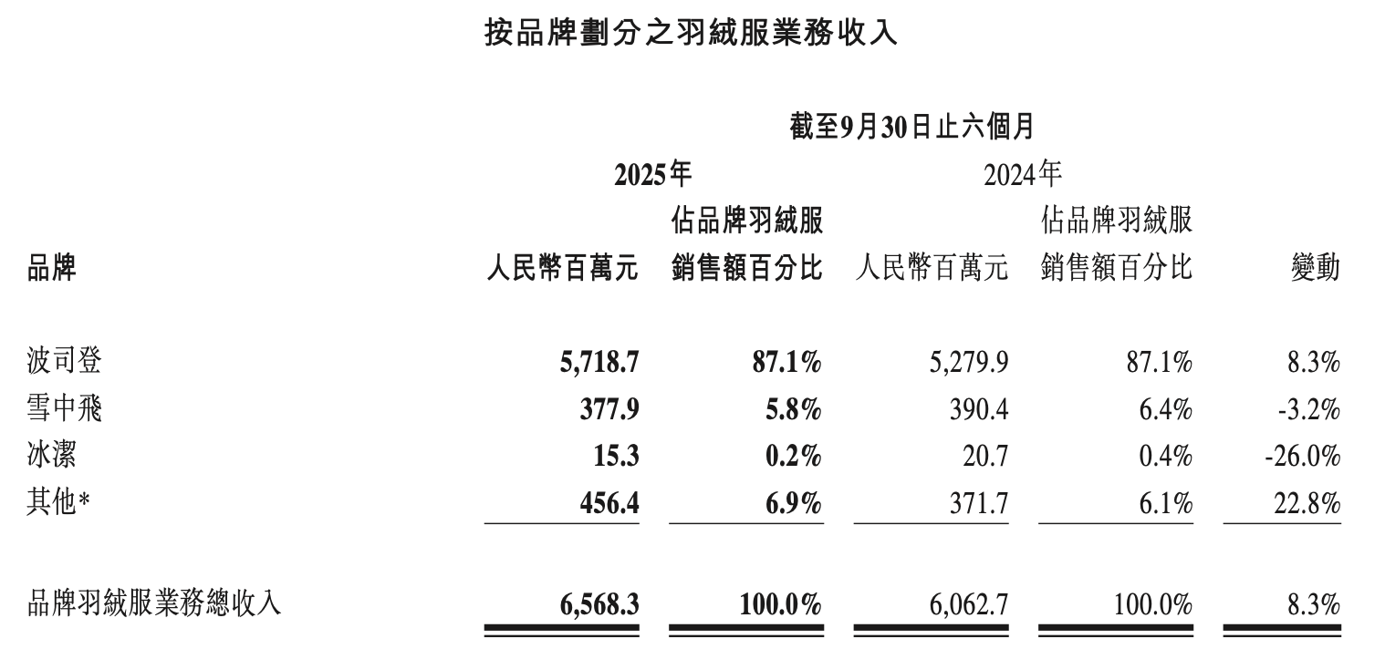 拉长时间线看,相比2023/24上半财年、2024/25上半财年高达28.1%、22.7%的收入增速,品牌羽绒服业务2025/26上半财年8.3%的收入增速有所放缓。