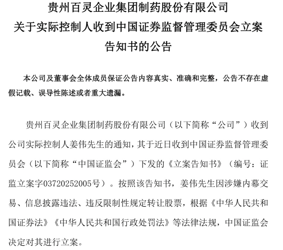 贵州百灵称,本次立案系对姜伟个人的调查,与公司日常经营无关,不会影响上市公司及子公司生产经营。姜伟将配合证监会的调查工作,公司将持续关注进展并及时履行信息披露义务。
