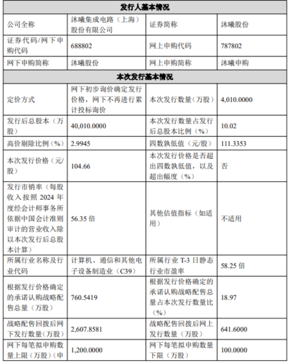 12月3日,沐曦股份发布首次公开发行股票并在科创板上市发行公告称,发行人与保荐人(主承销商)根据网下发行询价报价情况,协商确定本次发行价格为104.66元/股。