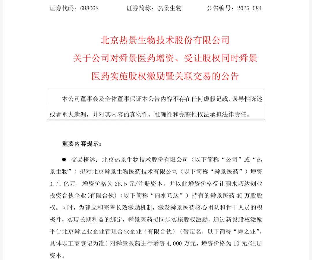 热景生物持续加码对舜景医药的投资。早在今年4月,热景生物便联合多方,对舜景医药增资约3亿元。如今再次增资,可见其对创新药赛道的重视。