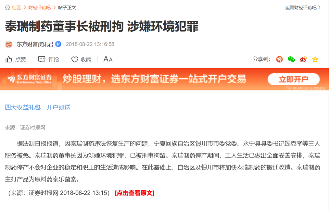 经检索,该报道目前在网上留存不多,仅能在部分平台看到转载版本。文章明确提到,“截至记者发稿时,泰瑞制药董事长因为涉嫌环境犯罪已被刑拘”,但相关姓名被删除。此外,彼时大量关于“董事长被刑拘”的新闻快讯,也均标注来源为《法制日报》。