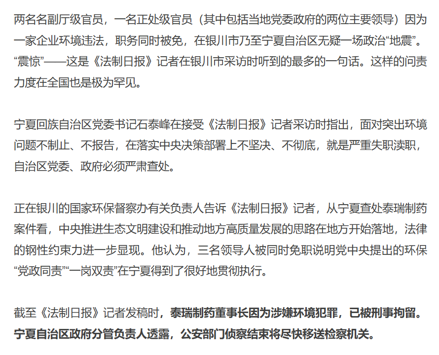 值得注意的是,2018年《法治日报》的报道刊发后,不少媒体发现时任宁夏女首富的祁秀萍才是泰瑞制药的实际控制人。这也带出公众对于“公司实际控制人、董事长、法人代表在环保违法事件中应分别承担哪些责任,祁秀萍是否应该担责”的相关争议。