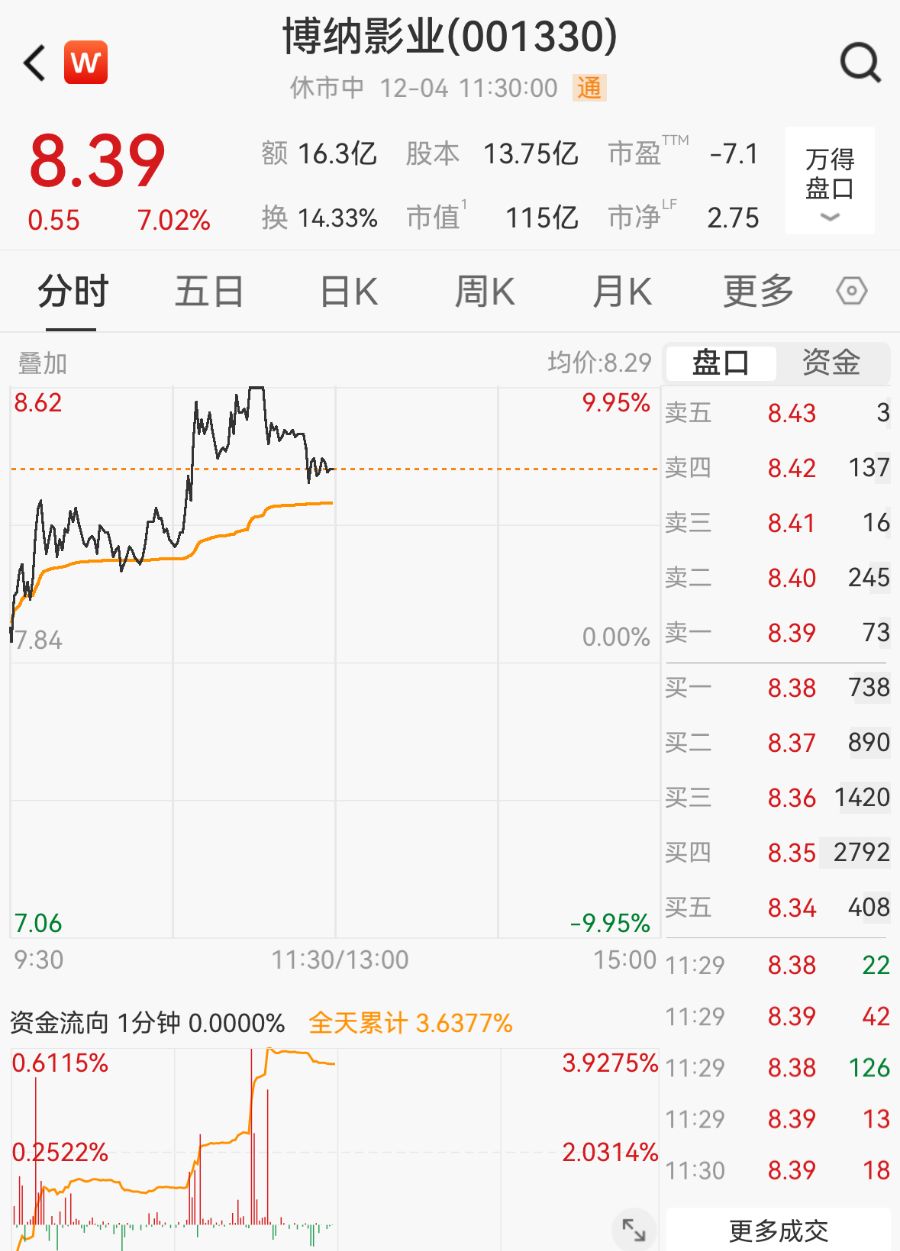 值得注意的是,近期电影《疯狂动物城2》热度持续攀升提振影视板块,博纳影业已实现股价3连阳,今天盘中一度触及涨停,截至午间收盘,涨7.02%,报8.39元/股,总市值为115亿元,年内涨超36%。