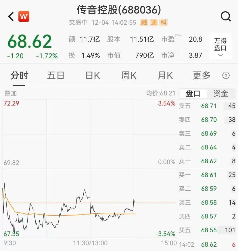 截至12月4日14:00左右,传音控股股价报68.62元/股,总市值789亿元。