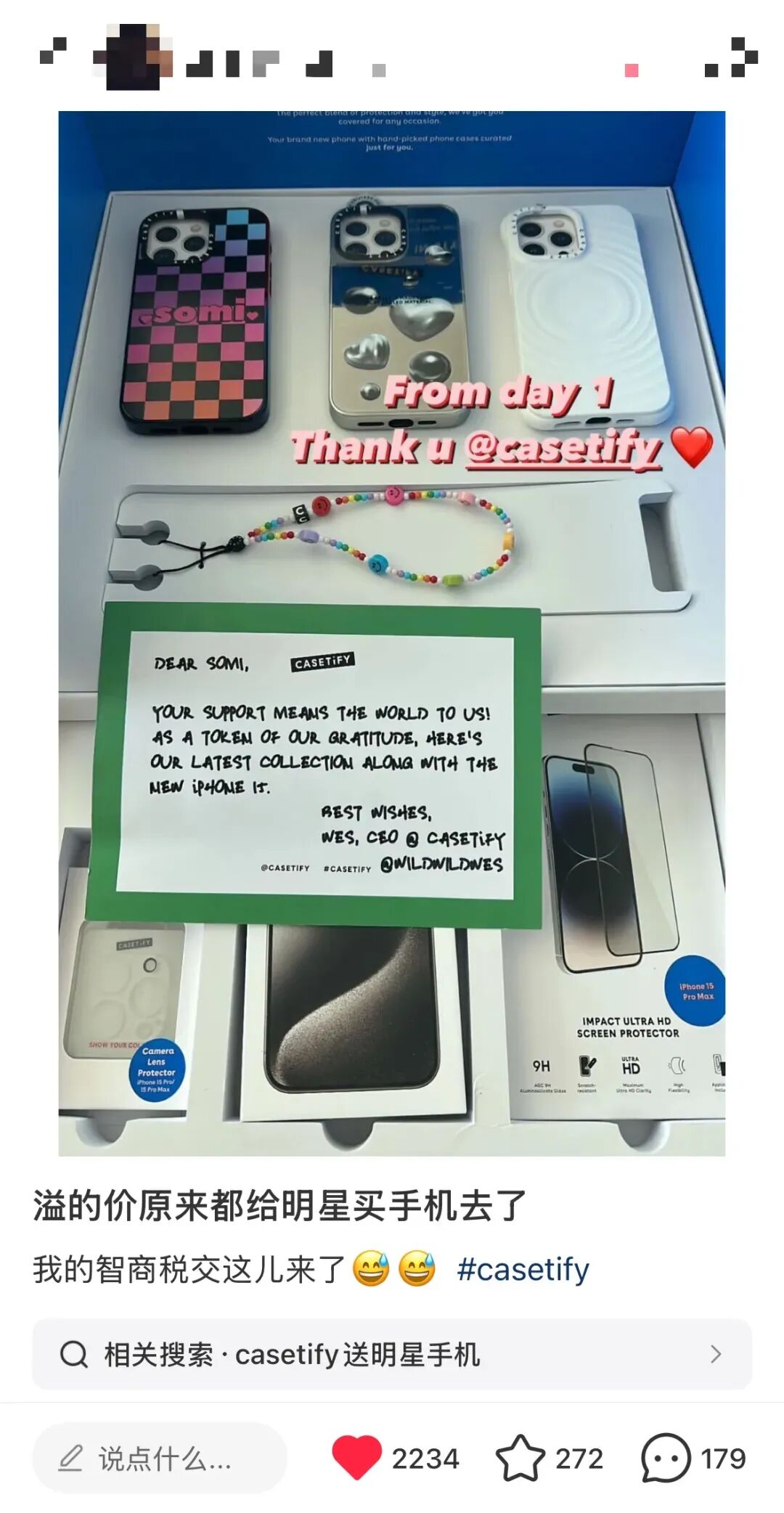 这并不是第一次。2023年,BLACKPINK成员Jisoo在社交平台晒出CASETiFY赠送的大礼包:最新款手机壳、最新款iPhone、甚至连钢化膜都贴好。网友看了只留下满屏问号——