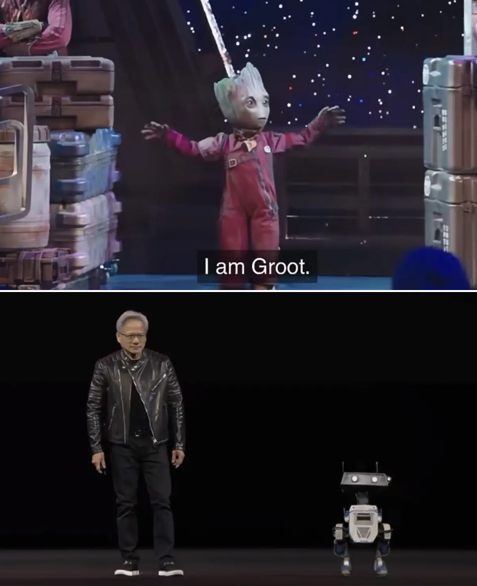 2021年,《银河护卫队》里不到一米高的树人格鲁特,就迈着双足走出了“我很萌但我不说”的步伐。今年,除了雪宝,在英伟达AI峰会上,酷似《星球大战》中小机器人瓦力的BDX压轴登场,扭着小屁股走路的样子,让黄仁勋都忍不住模仿。