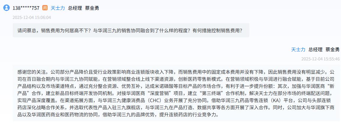互动交流部分,同样有投资者针对销售费用为何居高不下进行提问,并问及公司与华润三九的销售协同融合到了什么样的程度,有何措施控制销售费用。