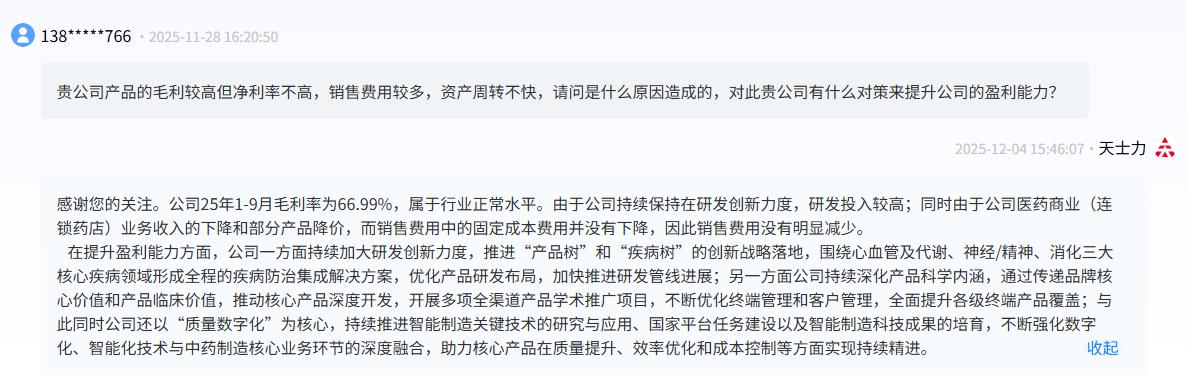 天士力对此回应称,公司2025年1-9月毛利率为66.99%,属于行业正常水平。由于公司持续保持在研发创新力度,研发投入较高;同时由于公司医药商业(连锁药店)业务收入的下降和部分产品降价,而销售费用中的固定成本费用并没有下降,因此销售费用没有明显减少。