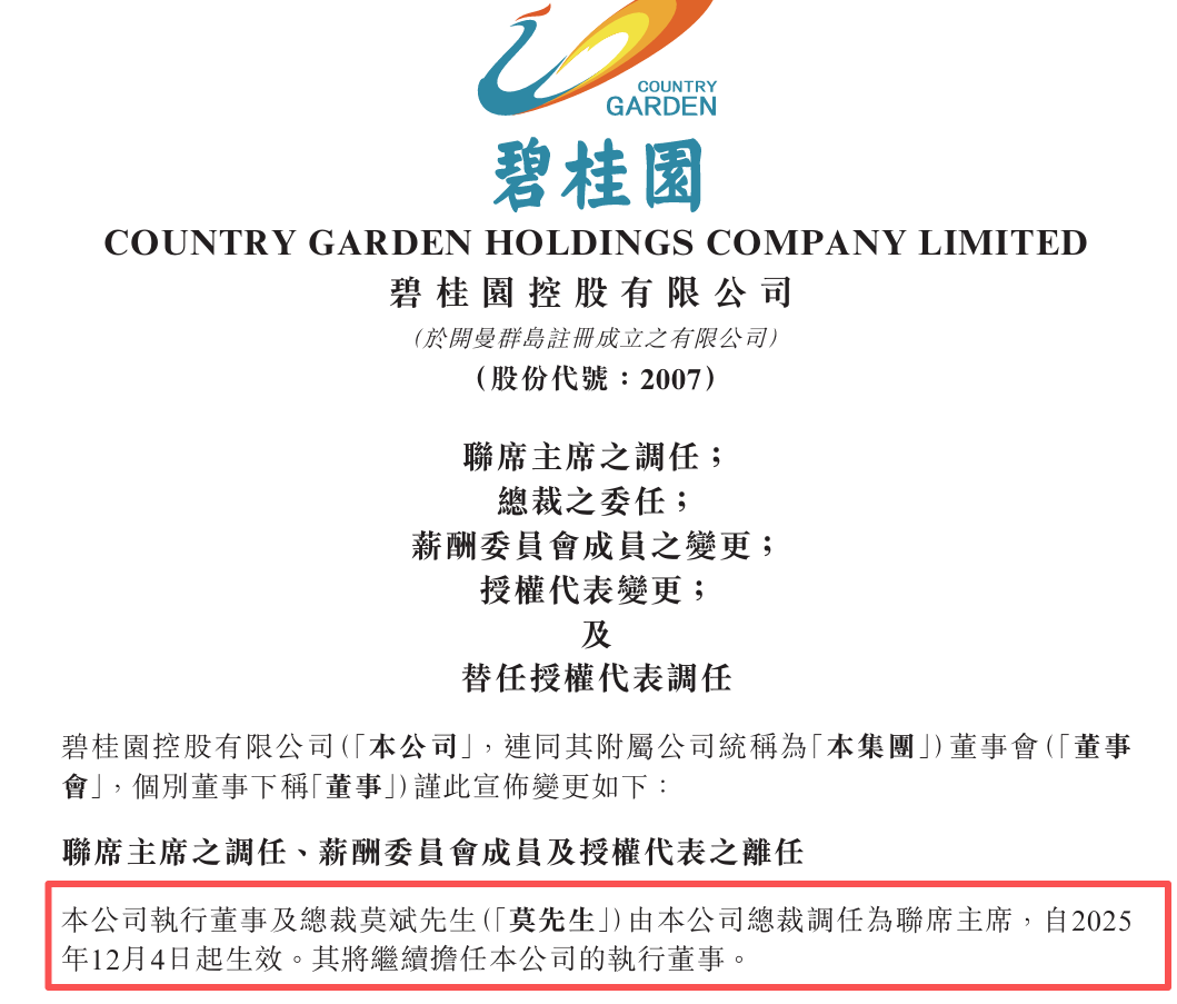 12月4日晚间,碧桂园发布一项重要人事变动:原执行董事及总裁莫斌调任为联席主席,同时辞任薪酬委员会成员及公司授权代表职务;原执行董事、常务副总裁程光煜获委任为公司总裁、薪酬委员会成员及授权代表,以上调整自2025年12月4日起生效。