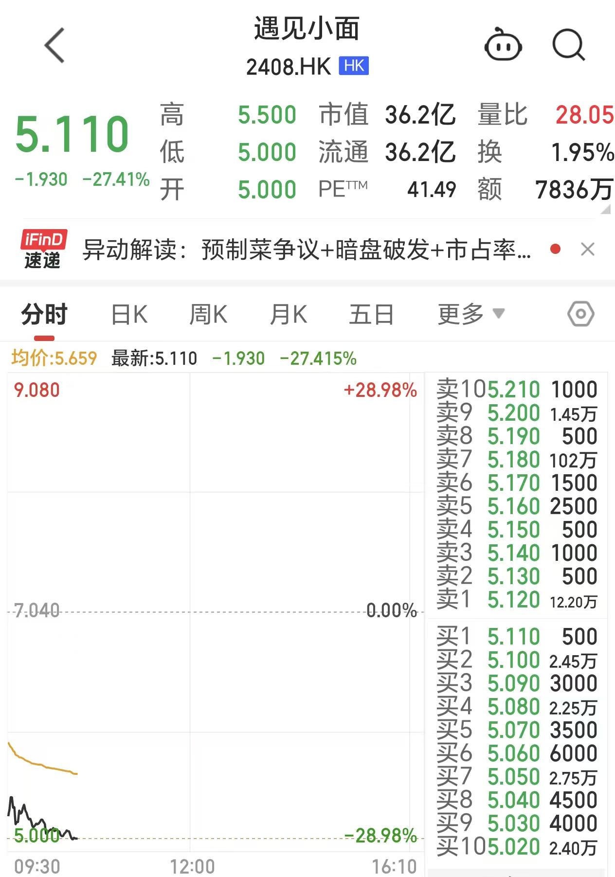 中新经纬12月5日电 5日,遇见小面正式在港交所挂牌。该股首日破发大幅低开近29%,截至发稿时,报5.11港元/股,跌幅27.41%,目前公司总市值36.2亿港元。