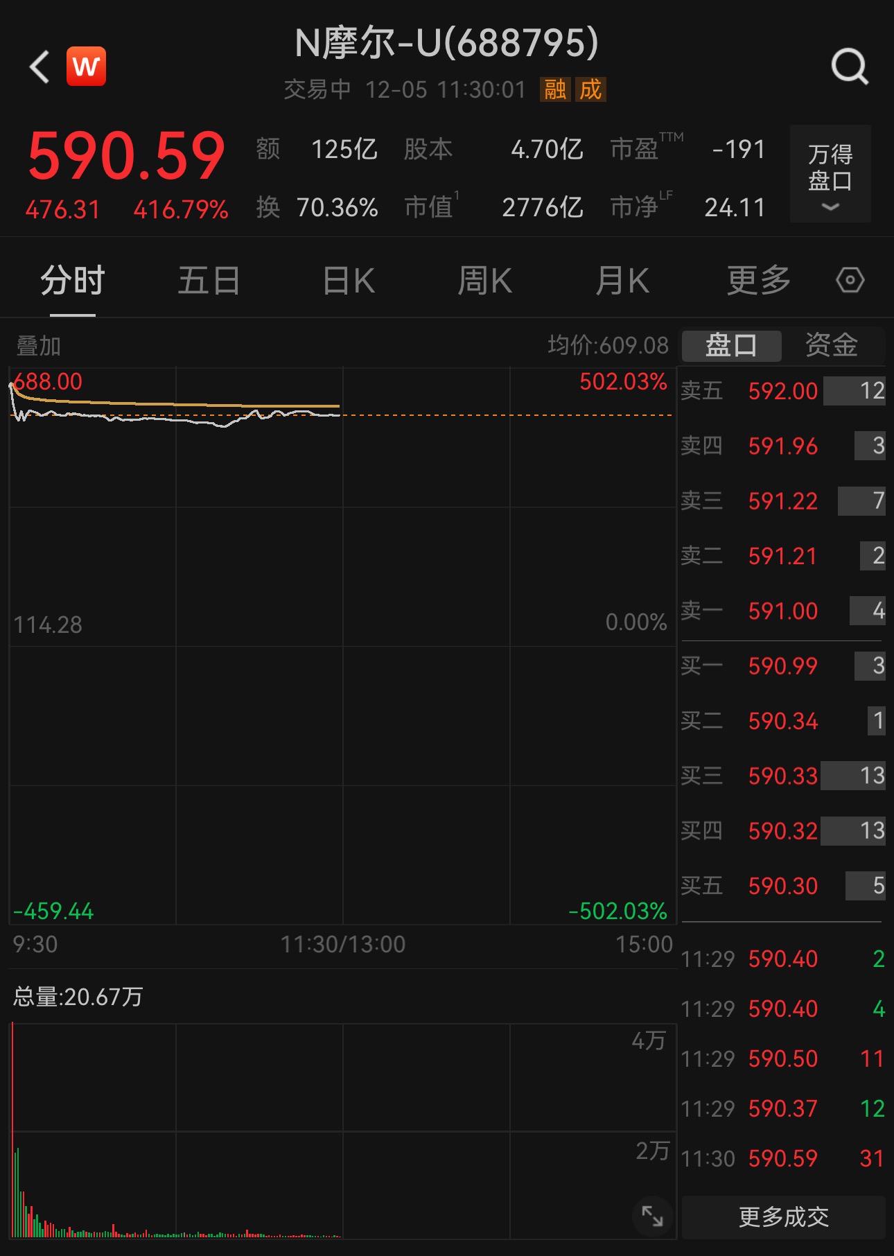 不过,摩尔线程开盘即巅峰,站上688元后迅速下撤,早盘最低报556元。截至午间收盘,摩尔线程涨416.79%报590.59元,成交额125亿元,换手率高达70.36%。