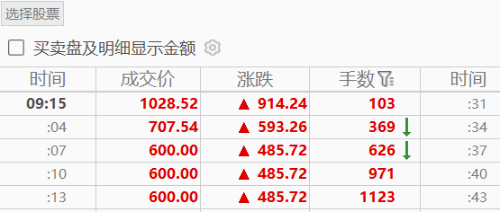 早盘9:15分集合竞价一开始,有投资者直接按照1028.52元/股申报了103手,合计金额1059万元,让今天的开盘显得不同凡响。