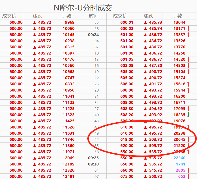 随后一段时间,投资者共同认可的价格是600元/股整数关口。但从9:24分开始,短短一分钟时间,多笔1-2万手的大单连续申报,将摩尔线程集合竞价开盘价直接从600元/股抬高到650元/股(相比于发售价上涨535.72元/股)。