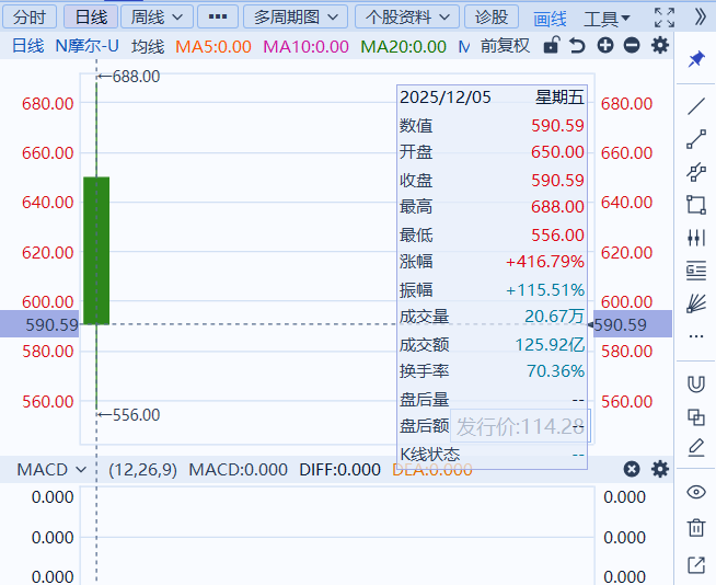 摩尔线程发行价格为114.28元/股,若以开盘价(650元/股)计算,中一签(500股)账面盈利超过26.78万元,成为年内最赚钱新股。