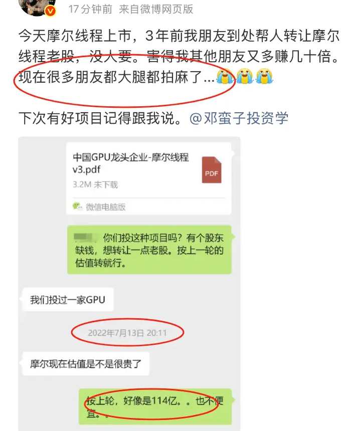 值得注意的是,看到股价大涨,有财经博主早上贴出了一张截图,说“3年前我朋友到处帮人转让摩尔线程老股,没人要”。同时,3年前公司的估值仅114亿,还被吐槽“不便宜”...