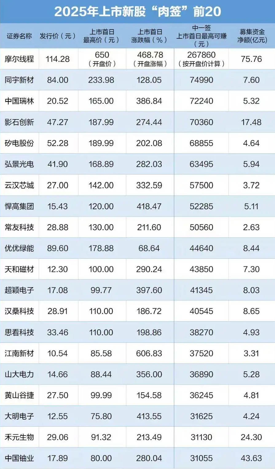 12月5日,国产GPU龙头摩尔线程(688795.SH)正式登陆科创板,以114.28元/股的发行价开盘后迅速拉升,盘中最高价触及463.98元/股,较发行价暴涨306%,创下年内新股首日涨幅新高。按中一签500股计算,投资者最高浮盈达27.48万元,超越今年7月上市的同宇新材,成为名副其实的“最赚钱新股”。