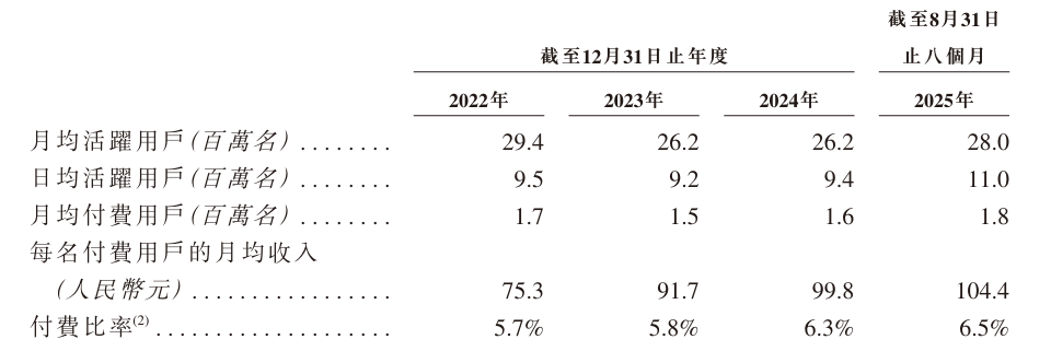 月均付费用户数量虽有所波动,但是付费比率和每名付费用户的月均收入持续上涨。付费比率从2022年的5.7%上涨到2025年前8个月的6.5%;每名付费用户的月均收入从2022年的75.3元,增长到了2025年前8个月的104.4元。