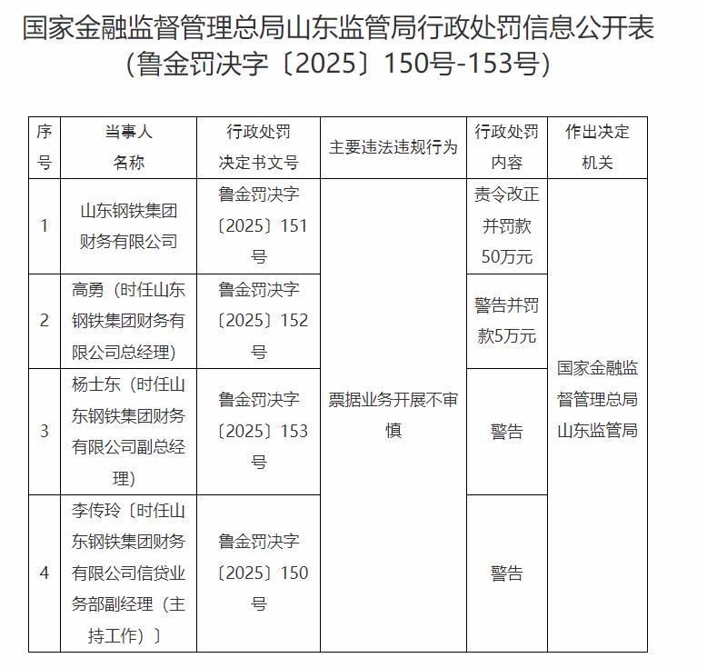 高勇,时任山东钢铁集团财务有限公司总经理,因其在管理层面未能有效把控业务风险,被予以警告处分,并被处以人民币5万元的罚款。杨士东,时任山东钢铁集团财务有限公司副总经理,鉴于其在业务开展过程中的管理职责,被予以警告处分。李传玲,时任山东钢铁集团财务有限公司信贷业务部副经理(主持工作),由于其在具体业务操作中的履职不到位,被予以警告处分。