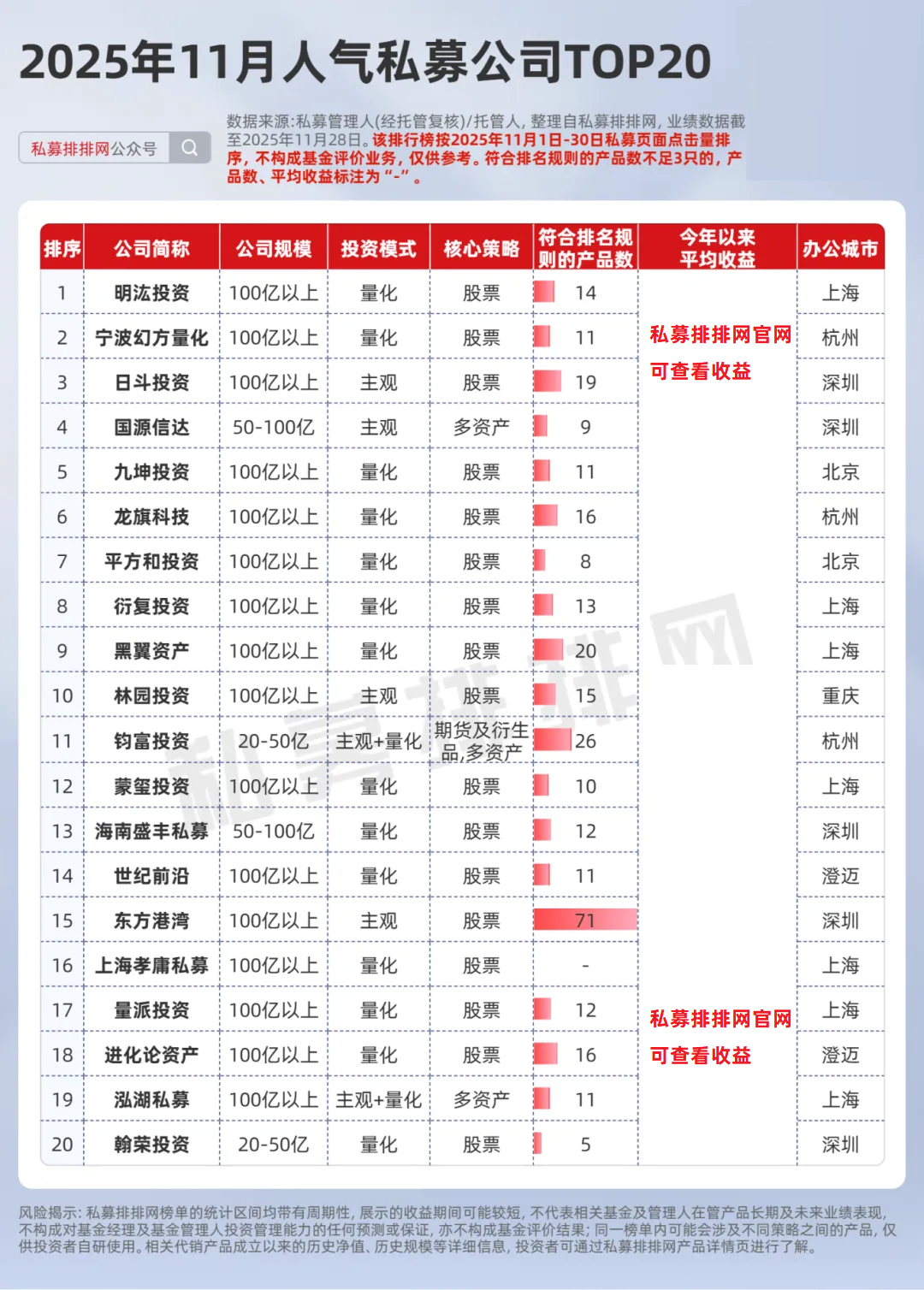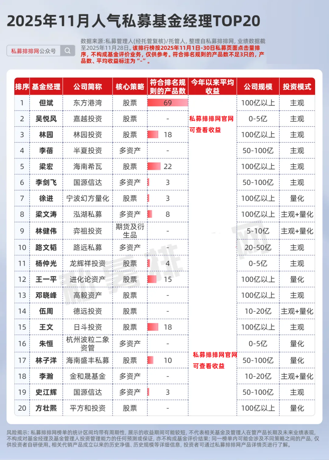 在此背景下,部分主观产品的业绩面临回撤,一些量化产品的超额收益则出现修复;CTA策略产品表现亮眼,受到投资者广泛关注。接下来,笔者将为大家盘点私募排排网2025年11月的人气私募基金经理、人气私募公司以及人气私募产品。