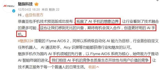 此外,魅族科技也第一时间向豆包抛去了橄榄枝,称豆包手拓展了AI手机的想象边界,让行业看到了技术融合的更多可能,也让我们感到无比的兴奋,期待深入合作,创造更好用的AI手机……
