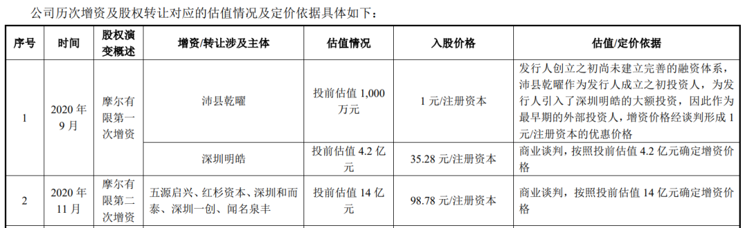 时间回到2020年9月,成立仅三个月且尚未建立完善融资体系的摩尔线程,迎来了第一位投资人“沛县乾曜”。又因“沛县乾曜作为发行人成立之初投资人,为发行人引入了深圳明皓的大额投资”,故而沛县乾曜作为最早期的外部投资人,以1元/注册资本的优惠价格、对应公司整体估值1000万元的价格顺利入场。而同期深圳明皓的入股价格为35.28元/注册资本。