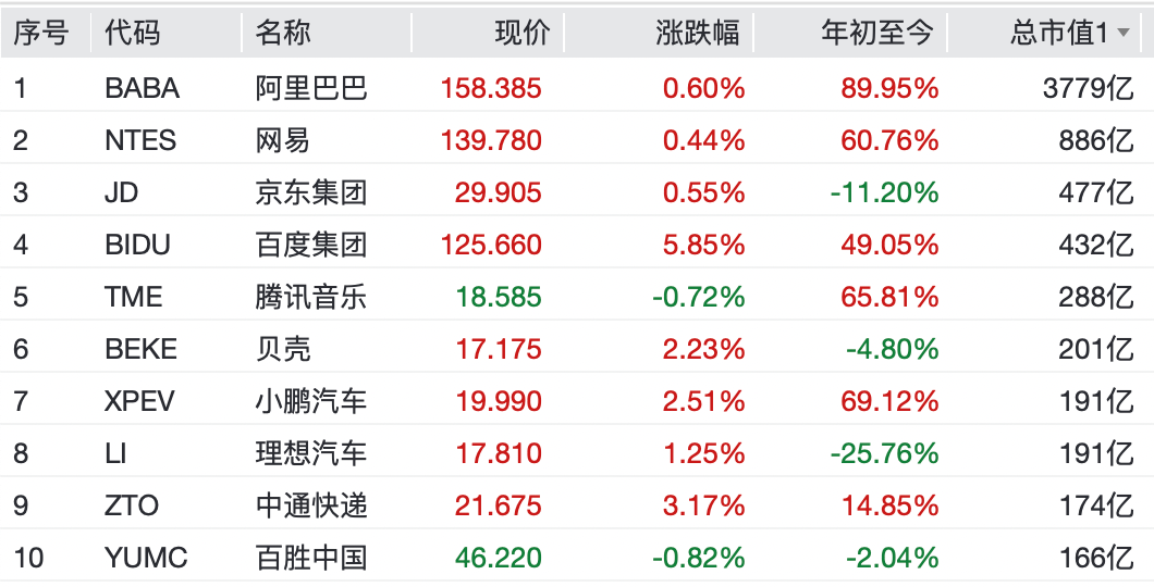 个股方面,叮咚买菜涨超11%,虎牙涨超6%,百度集团涨5.85%,中通快递涨超3%,贝壳、小鹏汽车涨超2%,阿里巴巴涨0.6%,多数核心中概股上涨。