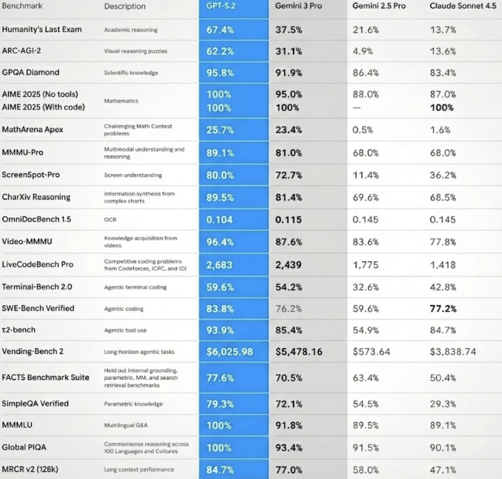 根据网友在社交媒体上贴出的对比图,GPT-5.2几乎全面碾压Gemini 3和Claude 4.5。不过这张图片的真实性尚未得到验证,但它确实反映出市场对OpenAI新模型的高度期待。