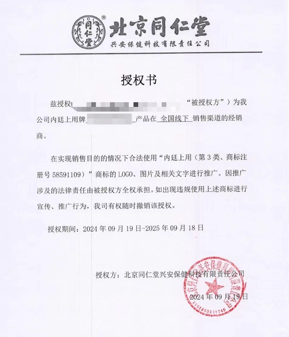 当被问及这类授权的真实性时,广东地区一名招商人员出示了一份北京同仁堂兴安保健授权某公司就“内廷上用牌xx膏”在全国线下渠道进行销售的授权书。授权书显示,可在实现销售目的的情况下合法使用“内廷上用(第3类、商标注册号58591109)”商标的LOGO、图片及相关文字进行推广。