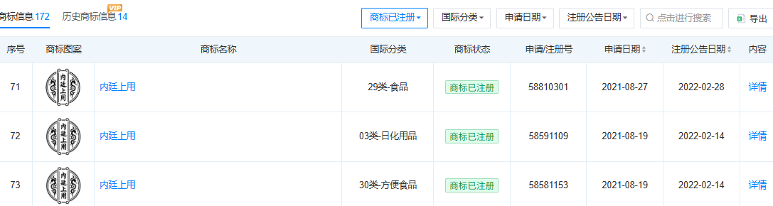 红星资本局在天眼查看到,北京同仁堂兴安保健、北京同仁堂(四川)药业此前在食品、广告销售等多个国际分类下都分别注册了“内廷上用”“朕皇”的相关商标。这两家公司还分别就“内廷上用”“朕皇”相关商标在方便食品、医药等国际分类下申请注册,目前在等待实质审查阶段。