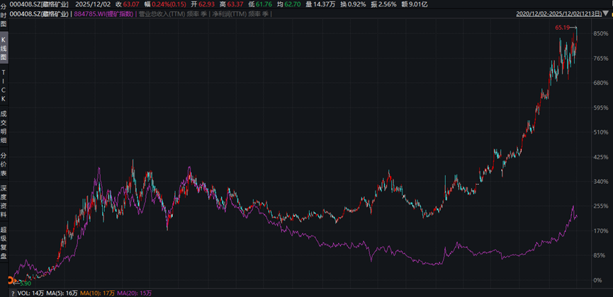 近5年,即2020年12月2日至2025年12月2日,锂矿指数上涨约2倍;同期,藏格矿业的股价则从前复权价6.71元升至63.07元,涨幅达8.4倍。