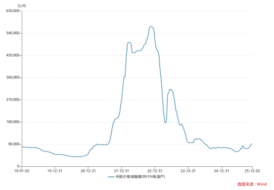 快速上涨期(2020年10月-2022年11月):价格从约4万元/吨起步,2021年末冲高至30万元/吨,涨幅超650%;2022年继续上行,11月触及历史峰值60万元/吨后见顶回落。期间累计上涨约14倍。